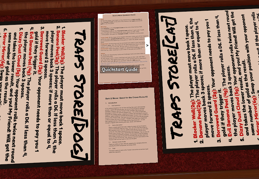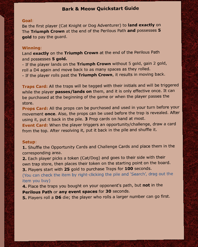 Game Premise: In the Medieval age, there were two of the most powerful kingdoms that started wars with each other over hundreds of years; they are the Dog and Cat Clans. You are playing as a dog advanturer or a cat knight to get the Triumph Crown before your enemy, the power of the crown can help your kingdom conquer the other kingdoms. To win the Crown, you have to manage your resources and make the right decision, and also try your best to slow down your enemy.