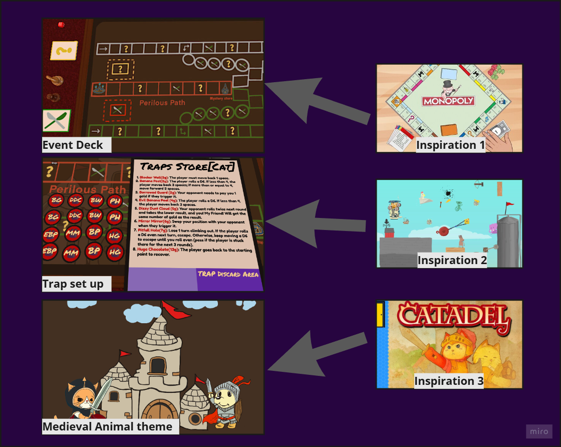 - Analyzing Games: I drew inspiration from the event deck in Monopoly and the trap and sabotage mechanics from Ultimate Chicken Horse.