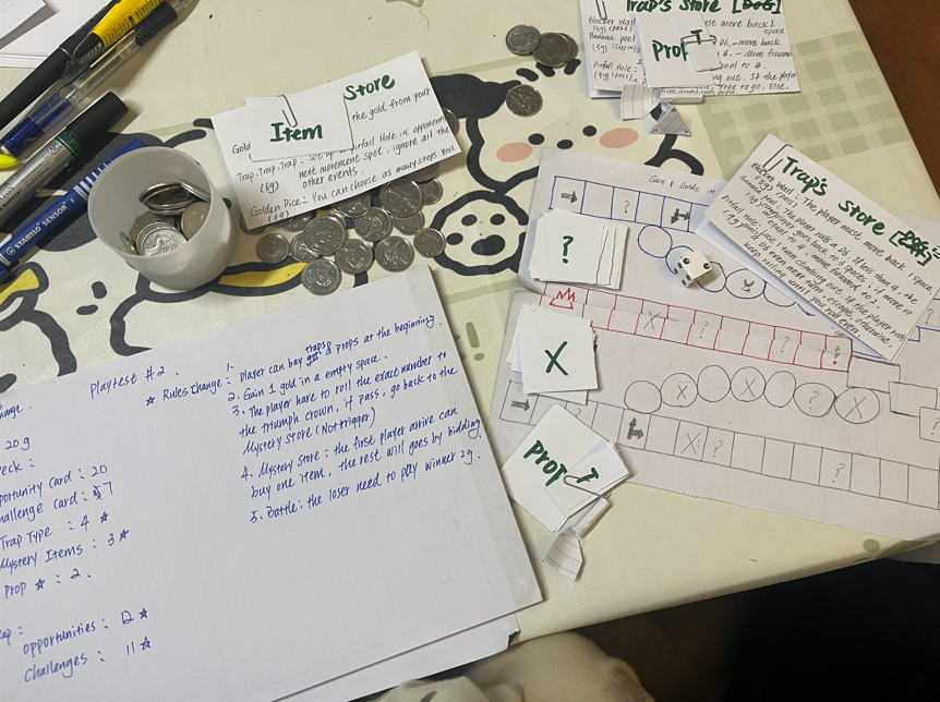 Feedback & Problem: Players highlighted the fun of the trap mechanic and the surprises created by the Opportunity cards. However, the game took too long during the trap-purchasing phase at the beginning, which slowed down the overall pace. Additionally, the peaceful path felt too disadvantageous because it was significantly longer than the challenging path.